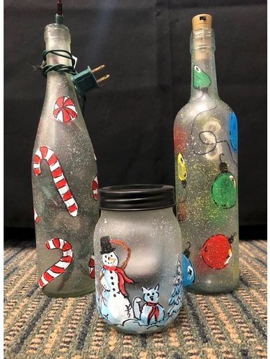 Participants will have the opportunity to complete three holiday themed lights. An upcycled bottle with a battery fairy lights, an upcycled bottle with plug in lights and a jar with a battery votive candle light. Acrylic paints will be used. Feel free to bring a snack and beverage. Dress for a mess!